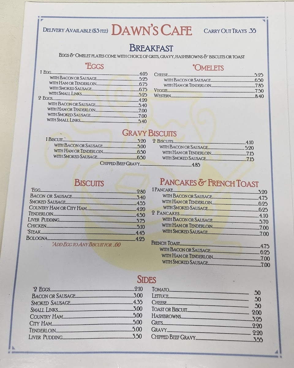Dawn's Cafe Menu